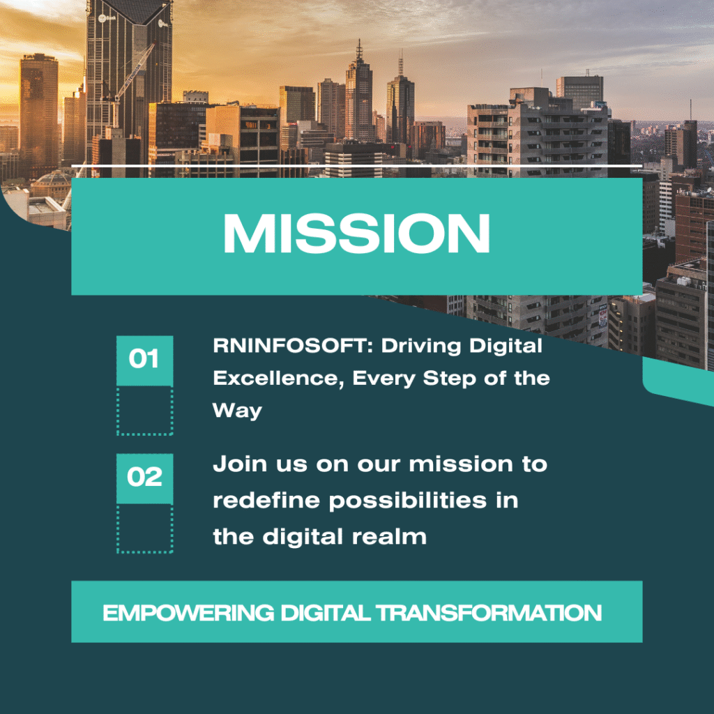 At RNINFOSOFT, our mission is clear: to redefine value by striking the perfect balance between quality and affordability. We are committed to providing top-notch website design and development, mobile application development, SEO, and other digital marketing services that meet the highest standards of excellence, while remaining accessible and affordable to businesses of all sizes.